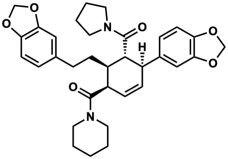 InChI=1S/C33H38N2O6/c36-32(34-14-2-1-3-15-34)26-11-10-24(23-8-13-28-30(19-23)41-21-39-28)31(33(37)35-16-4-5-17-35)25(26)9-6-22-7-12-27-29(18-22)40-20-38-27/h7-8,10-13,18-19,24-26,31H,1-6,9,14-17,20-21H2/t24-,25-,26-,31-/m1/s1 |
