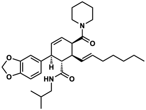 CCCCC/C=C/[C@H]1[C@H](C(=O)NCC(C)C)[C@@H](c2ccc3c(c2)OCO3)C=C[C@H]1C(=O)N1CCCCC1 |
