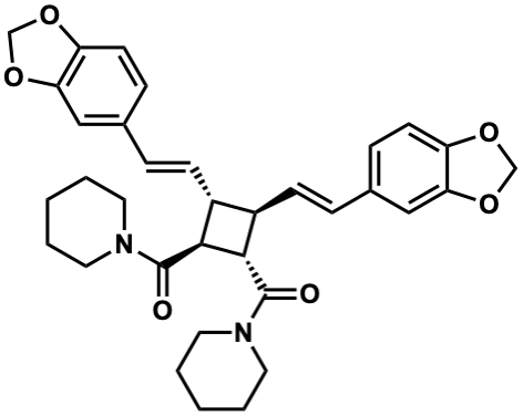 InChI=1S/C34H38N2O6/c37-33(35-15-3-1-4-16-35)31-25(11-7-23-9-13-27-29(19-23)41-21-39-27)26(32(31)34(38)36-17-5-2-6-18-36)12-8-24-10-14-28-30(20-24)42-22-40-28/h7-14,19-20,25-26,31-32H,1-6,15-18,21-22H2/b11-7+,12-8+/t25-,26-,31+,32+/m1/s1 |