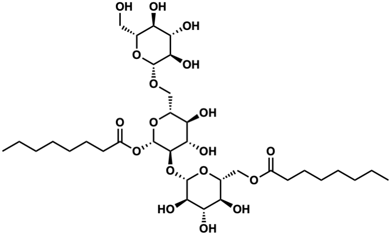 InChI=1S/C34H60O18/c1-3-5-7-9-11-13-21(36)46-16-19-24(39)27(42)30(45)33(49-19)52-31-28(43)25(40)20(50-34(31)51-22(37)14-12-10-8-6-4-2)17-47-32-29(44)26(41)23(38)18(15-35)48-32/h18-20,23-35,38-45H,3-17H2,1-2H3/t18-,19-,20-,23-,24-,25-,26+,27+,28+,29-,30-,31-,32-,33+,34+/m1/s1 |