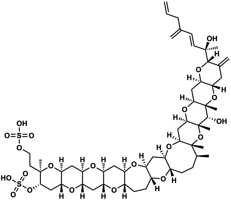 InChI=1S/C55H82O21S2/c1-10-11-28(2)16-17-51(5,57)49-29(3)20-43-42(71-49)26-46-54(8,74-43)50(56)55(9)48(72-46)27-47-53(7,76-55)30(4)12-13-31-36(70-47)21-34-32(65-31)14-15-33-35(67-34)22-38-37(66-33)23-39-40(68-38)24-44-41(69-39)25-45(75-78(61,62)63)52(6,73-44)18-19-64-77(58,59)60/h10,16-17,30-50,56-57H,1-3,11-15,18-27H2,4-9H3,(H,58,59,60)(H,61,62,63)/b17-16+/t30-,31-,32+,33-,34-,35+,36+,37+,38-,39-,40+,41+,42+,43-,44-,45-,46-,47-,48+,49-,50-,51+,52+,53+,54-,55+/m0/s1 |