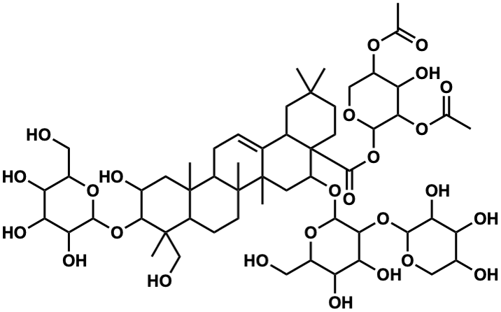 InChI=1S/C56H88O26/c1-23(60)75-31-21-74-48(43(38(31)67)76-24(2)61)82-50(72)56-14-13-51(3,4)15-26(56)25-9-10-33-52(5)16-27(62)45(81-47-42(71)39(68)36(65)29(18-57)77-47)53(6,22-59)32(52)11-12-54(33,7)55(25,8)17-34(56)79-49-44(40(69)37(66)30(19-58)78-49)80-46-41(70)35(64)28(63)20-73-46/h9,26-49,57-59,62-71H,10-22H2,1-8H3 |