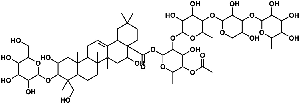 InChI=1S/C61H98O28/c1-23-35(68)37(70)40(73)51(80-23)86-47-30(66)21-79-50(44(47)77)85-45-24(2)81-52(42(75)39(45)72)87-48-43(76)46(83-26(4)64)25(3)82-54(48)89-55(78)61-16-15-56(5,6)17-28(61)27-11-12-33-57(7)18-29(65)49(88-53-41(74)38(71)36(69)31(20-62)84-53)58(8,22-63)32(57)13-14-59(33,9)60(27,10)19-34(61)67/h11,23-25,28-54,62-63,65-77H,12-22H2,1-10H3 |