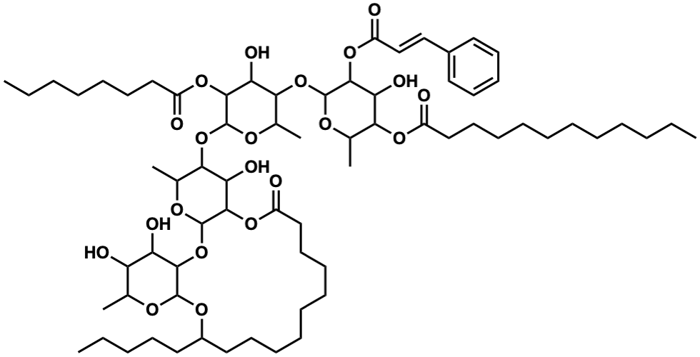 InChI=1S/C69H112O21/c1-8-11-14-16-17-18-21-25-33-39-50(70)84-59-45(5)80-67(63(56(59)76)87-53(73)43-42-48-35-29-27-30-36-48)88-60-46(6)81-68(64(57(60)77)85-51(71)40-32-23-15-12-9-2)89-61-47(7)82-69-65(58(61)78)86-52(72)41-34-26-22-19-20-24-31-38-49(37-28-13-10-3)83-66-62(90-69)55(75)54(74)44(4)79-66/h27,29-30,35-36,42-47,49,54-69,74-78H,8-26,28,31-34,37-41H2,1-7H3/b43-42+ |