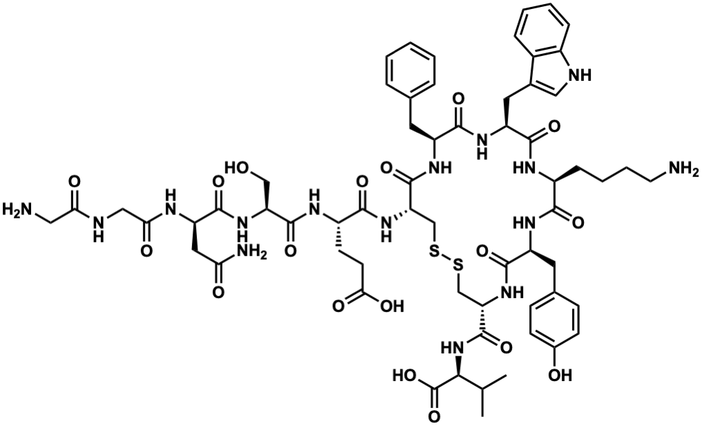 InChI=1S/C62H83N15O18S2/c1-32(2)52(62(94)95)77-61(93)47-31-97-96-30-46(75-54(86)40(19-20-51(83)84)70-59(91)45(29-78)74-58(90)44(25-48(65)80)68-50(82)28-67-49(81)26-64)60(92)72-41(22-33-10-4-3-5-11-33)55(87)73-43(24-35-27-66-38-13-7-6-12-37(35)38)57(89)69-39(14-8-9-21-63)53(85)71-42(56(88)76-47)23-34-15-17-36(79)18-16-34/h3-7,10-13,15-18,27,32,39-47,52,66,78-79H,8-9,14,19-26,28-31,63-64H2,1-2H3,(H2,65,80)(H,67,81)(H,68,82)(H,69,89)(H,70,91)(H,71,85)(H,72,92)(H,73,87)(H,74,90)(H,75,86)(H,76,88)(H,77,93)(H,83,84)(H,94,95)/t39-,40-,41-,42-,43-,44+,45-,46-,47-,52-/m0/s1 |