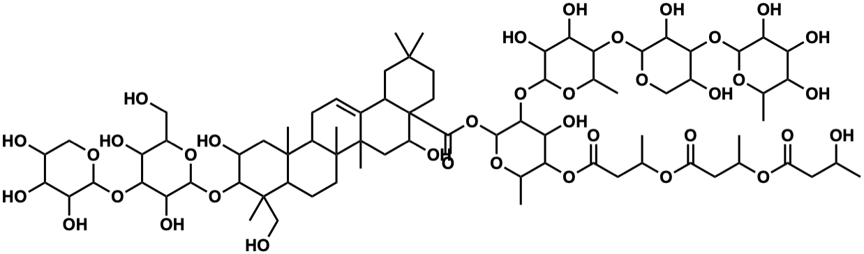 InChI=1S/C76H122O37/c1-29(79)19-44(84)101-30(2)20-45(85)102-31(3)21-46(86)107-59-34(6)105-69(62(55(59)95)111-67-54(94)51(91)58(33(5)104-67)108-65-56(96)60(39(82)27-100-65)109-66-53(93)50(90)47(87)32(4)103-66)113-70(98)76-18-17-71(7,8)22-36(76)35-13-14-42-72(9)23-37(80)63(73(10,28-78)41(72)15-16-74(42,11)75(35,12)24-43(76)83)112-68-57(97)61(49(89)40(25-77)106-68)110-64-52(92)48(88)38(81)26-99-64/h13,29-34,36-43,47-69,77-83,87-97H,14-28H2,1-12H3 |