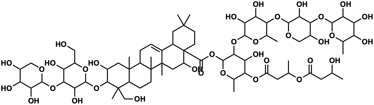 InChI=1S/C72H116O35/c1-27(75)18-41(80)96-28(2)19-42(81)101-55-31(5)99-65(58(51(55)90)105-63-50(89)47(86)54(30(4)98-63)102-61-52(91)56(36(78)25-95-61)103-62-49(88)46(85)43(82)29(3)97-62)107-66(93)72-17-16-67(6,7)20-33(72)32-12-13-39-68(8)21-34(76)59(69(9,26-74)38(68)14-15-70(39,10)71(32,11)22-40(72)79)106-64-53(92)57(45(84)37(23-73)100-64)104-60-48(87)44(83)35(77)24-94-60/h12,27-31,33-40,43-65,73-79,82-92H,13-26H2,1-11H3 |