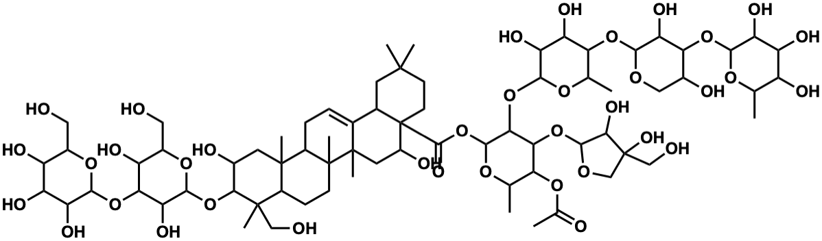 InChI=1S/C72H116O37/c1-26-39(81)42(84)45(87)59(97-26)104-52-33(79)22-95-58(48(52)90)103-50-27(2)98-60(47(89)44(50)86)107-55-54(106-64-56(92)71(94,24-76)25-96-64)51(100-29(4)77)28(3)99-63(55)109-65(93)72-16-15-66(5,6)17-31(72)30-11-12-37-67(7)18-32(78)57(68(8,23-75)36(67)13-14-69(37,9)70(30,10)19-38(72)80)108-62-49(91)53(41(83)35(21-74)102-62)105-61-46(88)43(85)40(82)34(20-73)101-61/h11,26-28,31-64,73-76,78-92,94H,12-25H2,1-10H3 |
