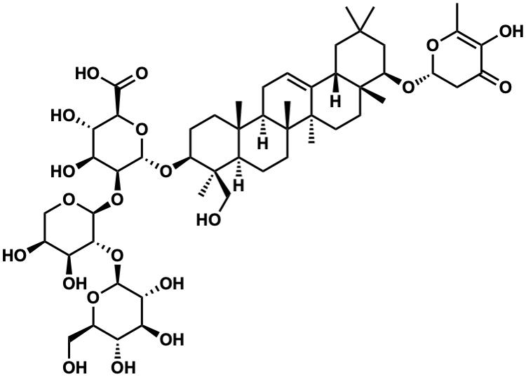 InChI=1S/C53H82O21/c1-23-34(58)26(56)17-33(68-23)70-32-19-48(2,3)18-25-24-9-10-30-50(5)13-12-31(51(6,22-55)29(50)11-14-53(30,8)52(24,7)16-15-49(25,32)4)71-47-43(39(63)38(62)41(72-47)44(65)66)74-46-42(35(59)27(57)21-67-46)73-45-40(64)37(61)36(60)28(20-54)69-45/h9,25,27-33,35-43,45-47,54-55,57-64H,10-22H2,1-8H3,(H,65,66)/t25-,27-,28+,29+,30+,31-,32+,33-,35-,36+,37-,38-,39-,40+,41-,42+,43-,45-,46-,47-,49+,50-,51+,52+,53+/m0/s1 |