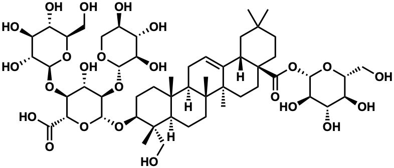 InChI=1S/C53H84O24/c1-48(2)13-15-53(47(69)77-45-37(65)34(62)32(60)26(19-55)72-45)16-14-51(5)22(23(53)17-48)7-8-28-49(3)11-10-29(50(4,21-56)27(49)9-12-52(28,51)6)73-46-40(75-43-35(63)30(58)24(57)20-70-43)38(66)39(41(76-46)42(67)68)74-44-36(64)33(61)31(59)25(18-54)71-44/h7,23-41,43-46,54-66H,8-21H2,1-6H3,(H,67,68)/t23-,24+,25+,26+,27+,28+,29-,30-,31+,32+,33-,34-,35+,36+,37+,38-,39-,40+,41-,43-,44-,45-,46+,49-,50-,51+,52+,53-/m0/s1 |