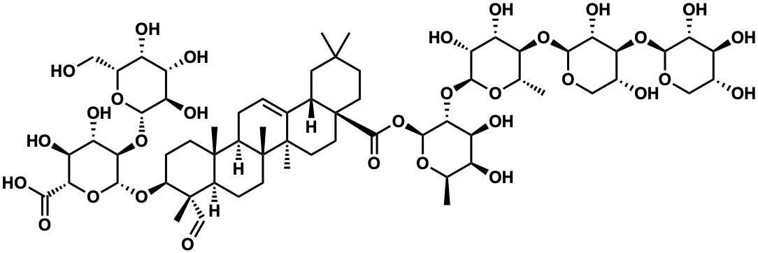InChI=1S/C64H100O31/c1-24-34(69)38(73)49(93-54-44(79)41(76)46(25(2)87-54)90-53-45(80)47(29(68)22-85-53)91-52-42(77)35(70)28(67)21-84-52)56(86-24)95-58(83)64-17-15-59(3,4)19-27(64)26-9-10-32-60(5)13-12-33(61(6,23-66)31(60)11-14-63(32,8)62(26,7)16-18-64)89-57-50(40(75)39(74)48(92-57)51(81)82)94-55-43(78)37(72)36(71)30(20-65)88-55/h9,23-25,27-50,52-57,65,67-80H,10-22H2,1-8H3,(H,81,82)/t24-,25+,27+,28-,29-,30-,31-,32-,33+,34+,35+,36+,37+,38+,39+,40+,41+,42-,43-,44-,45-,46+,47+,48+,49-,50-,52+,53+,54+,55+,56+,57-,60+,61+,62-,63-,64+/m1/s1 |