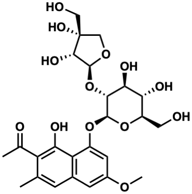 InChI=1S/C25H32O13/c1-10-4-12-5-13(34-3)6-14(17(12)19(30)16(10)11(2)28)36-23-21(20(31)18(29)15(7-26)37-23)38-24-22(32)25(33,8-27)9-35-24/h4-6,15,18,20-24,26-27,29-33H,7-9H2,1-3H3/t15-,18-,20+,21-,22+,23-,24+,25-/m1/s1 |