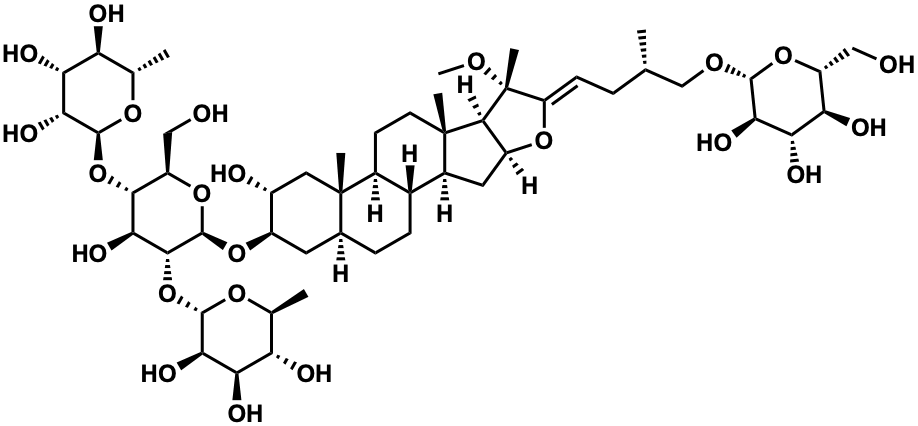 InChI=1S/C52H86O23/c1-20(19-67-46-39(62)38(61)35(58)30(17-53)72-46)8-11-32-52(6,66-7)45-29(70-32)15-26-24-10-9-23-14-28(27(55)16-51(23,5)25(24)12-13-50(26,45)4)71-49-44(75-48-41(64)37(60)34(57)22(3)69-48)42(65)43(31(18-54)73-49)74-47-40(63)36(59)33(56)21(2)68-47/h11,20-31,33-49,53-65H,8-10,12-19H2,1-7H3/b32-11-/t20-,21-,22-,23-,24+,25-,26-,27+,28+,29-,30+,31+,33-,34-,35+,36+,37+,38-,39+,40+,41+,42-,43+,44+,45-,46+,47-,48-,49+,50-,51-,52+/m0/s1 |