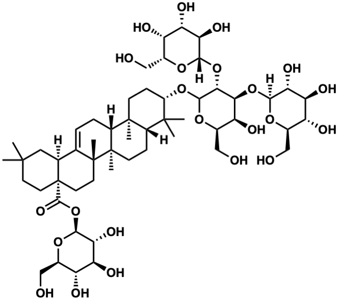 InChI=1S/C54H88O23/c1-49(2)14-16-54(48(69)77-46-41(68)38(65)34(61)27(21-57)72-46)17-15-52(6)23(24(54)18-49)8-9-30-51(5)12-11-31(50(3,4)29(51)10-13-53(30,52)7)74-47-43(76-45-40(67)37(64)33(60)26(20-56)71-45)42(35(62)28(22-58)73-47)75-44-39(66)36(63)32(59)25(19-55)70-44/h8,24-47,55-68H,9-22H2,1-7H3/t24-,25+,26+,27+,28+,29-,30+,31-,32+,33-,34+,35-,36-,37-,38-,39+,40+,41+,42-,43+,44-,45-,46-,47?,51-,52+,53+,54-/m0/s1 |