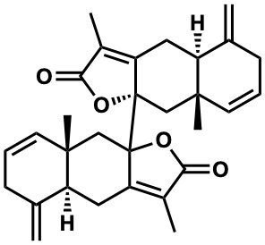 InChI=1S/C30H34O4/c1-17-9-7-11-27(5)15-29(23(13-21(17)27)19(3)25(31)33-29)30-16-28(6)12-8-10-18(2)22(28)14-24(30)20(4)26(32)34-30/h7-8,11-12,21-22H,1-2,9-10,13-16H2,3-6H3/t21-,22-,27+,28+,29-,30?/m0/s1 |
