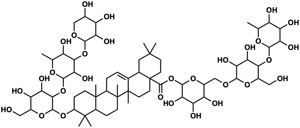 InChI=1S/C65H106O30/c1-25-36(69)41(74)46(79)55(86-25)92-50-31(22-67)89-53(48(81)44(50)77)85-24-32-40(73)42(75)47(80)56(90-32)95-59(83)65-18-16-60(3,4)20-28(65)27-10-11-34-62(7)14-13-35(61(5,6)33(62)12-15-64(34,9)63(27,8)17-19-65)91-58-52(43(76)39(72)30(21-66)88-58)94-57-49(82)51(37(70)26(2)87-57)93-54-45(78)38(71)29(68)23-84-54/h10,25-26,28-58,66-82H,11-24H2,1-9H3 |