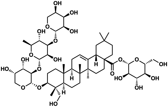 InChI=1S/C52H84O21/c1-23-32(57)40(71-42-37(62)33(58)26(55)20-66-42)39(64)44(68-23)72-41-34(59)27(56)21-67-45(41)70-31-11-12-48(4)29(49(31,5)22-54)10-13-51(7)30(48)9-8-24-25-18-47(2,3)14-16-52(25,17-15-50(24,51)6)46(65)73-43-38(63)36(61)35(60)28(19-53)69-43/h8,23,25-45,53-64H,9-22H2,1-7H3/t23-,25-,26+,27-,28+,29+,30+,31-,32-,33+,34-,35+,36-,37+,38+,39+,40+,41+,42-,43-,44-,45-,48-,49-,50+,51+,52-/m0/s1 |