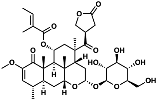InChI=1S/C37H52O14/c1-8-16(2)33(45)48-21-13-35(4,31(43)18-10-25(39)47-15-18)23-12-26(51-34-29(42)28(41)27(40)22(14-38)49-34)50-24-11-19-17(3)9-20(46-7)32(44)36(19,5)30(21)37(23,24)6/h8-9,17-19,21-24,26-30,34,38,40-42H,10-15H2,1-7H3/b16-8+/t17-,18-,19+,21-,22-,23+,24-,26+,27-,28+,29-,30-,34+,35-,36+,37-/m1/s1 |