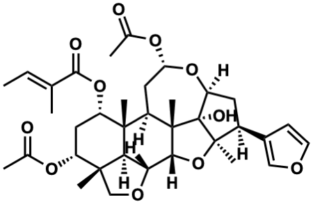 InChI=1S/C36H48O11/c1-10-18(2)30(39)46-24-14-23(43-19(3)37)31(5)17-42-27-28(31)33(24,7)22-13-26(44-20(4)38)45-25-15-32(6,21-11-12-41-16-21)35(9)36(25,40)34(22,8)29(27)47-35/h10-12,16,22-29,40H,13-15,17H2,1-9H3/b18-10+/t22-,23-,24+,25+,26-,27-,28+,29-,31-,32+,33+,34+,35-,36+/m1/s1 |