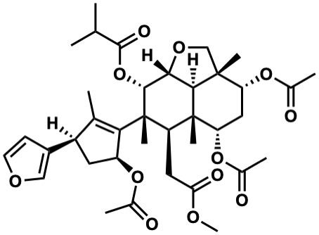 InChI=1S/C37H50O12/c1-18(2)34(42)49-33-31-32-35(7,17-45-31)27(47-21(5)39)15-28(48-22(6)40)36(32,8)26(14-29(41)43-10)37(33,9)30-19(3)24(23-11-12-44-16-23)13-25(30)46-20(4)38/h11-12,16,18,24-28,31-33H,13-15,17H2,1-10H3/t24-,25+,26-,27-,28+,31-,32+,33-,35-,36+,37-/m1/s1 |