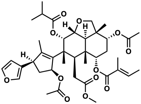 InChI=1S/C40H54O12/c1-12-21(4)37(45)51-30-17-29(50-24(7)42)38(8)19-48-33-34(38)39(30,9)28(16-31(43)46-11)40(10,35(33)52-36(44)20(2)3)32-22(5)26(25-13-14-47-18-25)15-27(32)49-23(6)41/h12-14,18,20,26-30,33-35H,15-17,19H2,1-11H3/b21-12+/t26-,27+,28-,29-,30+,33-,34+,35-,38-,39+,40-/m1/s1 |