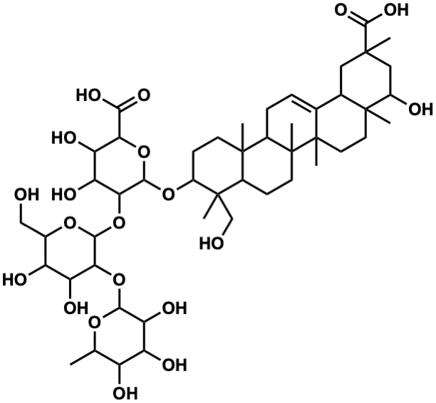 InChI=1S/C48H76O20/c1-20-28(52)30(54)34(58)39(63-20)67-36-31(55)29(53)23(18-49)64-40(36)68-37-33(57)32(56)35(38(59)60)66-41(37)65-27-11-12-45(4)24(46(27,5)19-50)10-13-48(7)25(45)9-8-21-22-16-43(2,42(61)62)17-26(51)44(22,3)14-15-47(21,48)6/h8,20,22-37,39-41,49-58H,9-19H2,1-7H3,(H,59,60)(H,61,62) |