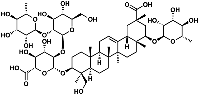 InChI=1S/C54H86O24/c1-21-30(57)33(60)38(65)44(71-21)75-29-18-49(3,48(69)70)17-24-23-9-10-27-51(5)13-12-28(52(6,20-56)26(51)11-14-54(27,8)53(23,7)16-15-50(24,29)4)74-47-42(37(64)36(63)40(76-47)43(67)68)78-46-41(35(62)32(59)25(19-55)73-46)77-45-39(66)34(61)31(58)22(2)72-45/h9,21-22,24-42,44-47,55-66H,10-20H2,1-8H3,(H,67,68)(H,69,70)/t21-,22-,24-,25+,26+,27+,28-,29+,30-,31-,32+,33+,34+,35-,36-,37-,38+,39+,40-,41+,42+,44-,45-,46-,47+,49-,50+,51-,52+,53+,54+/m0/s1 |