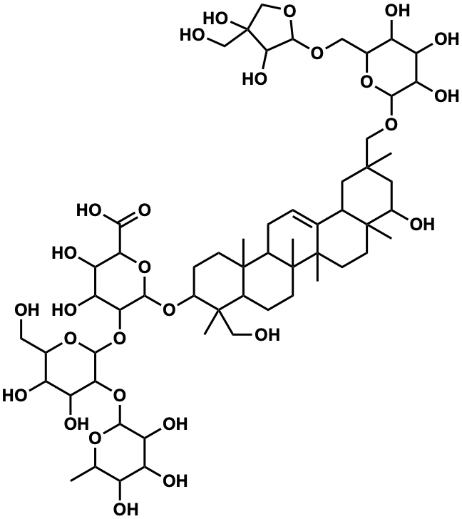 InChI=1S/C59H96O28/c1-24-33(64)36(67)42(73)49(81-24)86-44-38(69)34(65)27(18-60)82-50(44)87-45-40(71)39(70)43(47(75)76)85-51(45)84-32-11-12-55(4)29(56(32,5)20-61)10-13-58(7)30(55)9-8-25-26-16-53(2,17-31(63)54(26,3)14-15-57(25,58)6)22-79-48-41(72)37(68)35(66)28(83-48)19-78-52-46(74)59(77,21-62)23-80-52/h8,24,26-46,48-52,60-74,77H,9-23H2,1-7H3,(H,75,76) |