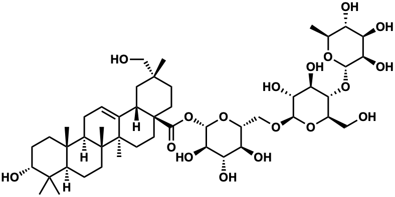InChI=1S/C48H78O18/c1-22-30(52)32(54)35(57)40(62-22)65-38-25(19-49)63-39(37(59)34(38)56)61-20-26-31(53)33(55)36(58)41(64-26)66-42(60)48-16-14-44(4,21-50)18-24(48)23-8-9-28-45(5)12-11-29(51)43(2,3)27(45)10-13-47(28,7)46(23,6)15-17-48/h8,22,24-41,49-59H,9-21H2,1-7H3/t22-,24-,25+,26+,27-,28+,29+,30-,31+,32+,33-,34+,35+,36+,37+,38+,39+,40-,41-,44+,45-,46+,47+,48-/m0/s1 |
