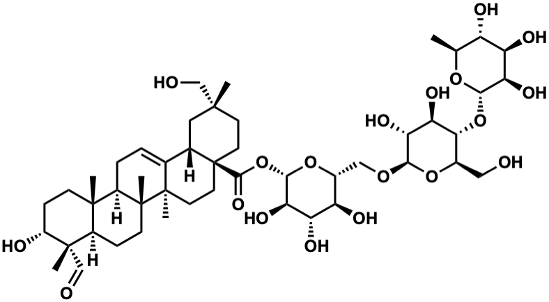 InChI=1S/C48H76O19/c1-22-30(53)32(55)35(58)40(63-22)66-38-25(18-49)64-39(37(60)34(38)57)62-19-26-31(54)33(56)36(59)41(65-26)67-42(61)48-15-13-43(2,20-50)17-24(48)23-7-8-28-44(3)11-10-29(52)45(4,21-51)27(44)9-12-47(28,6)46(23,5)14-16-48/h7,21-22,24-41,49-50,52-60H,8-20H2,1-6H3/t22-,24-,25+,26+,27+,28+,29+,30-,31+,32+,33-,34+,35+,36+,37+,38+,39+,40-,41-,43+,44-,45-,46+,47+,48-/m0/s1 |