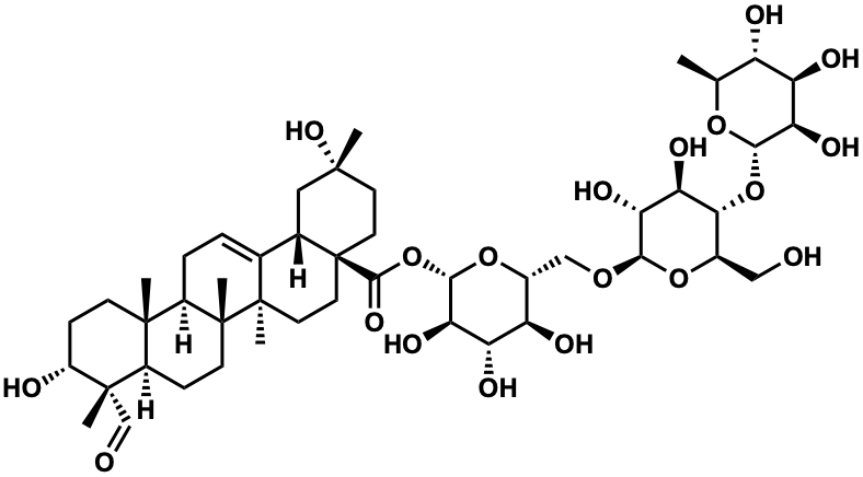InChI=1S/C47H74O19/c1-21-29(51)31(53)34(56)39(62-21)65-37-24(18-48)63-38(36(58)33(37)55)61-19-25-30(52)32(54)35(57)40(64-25)66-41(59)47-15-13-42(2,60)17-23(47)22-7-8-27-43(3)11-10-28(50)44(4,20-49)26(43)9-12-46(27,6)45(22,5)14-16-47/h7,20-21,23-40,48,50-58,60H,8-19H2,1-6H3/t21-,23-,24+,25+,26+,27+,28+,29-,30+,31+,32-,33+,34+,35+,36+,37+,38+,39-,40-,42+,43-,44-,45+,46+,47-/m0/s1 |