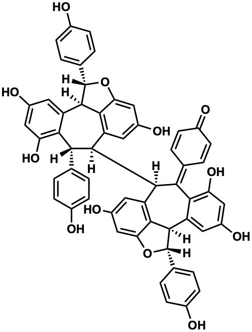 InChI=1S/C56H40O12/c57-29-9-1-25(2-10-29)45-47-37(17-33(61)21-41(47)65)53-49-39(19-35(63)23-43(49)67-55(53)27-5-13-31(59)14-6-27)51(45)52-40-20-36(64)24-44-50(40)54(56(68-44)28-7-15-32(60)16-8-28)38-18-34(62)22-42(66)48(38)46(52)26-3-11-30(58)12-4-26/h1-24,45,51-57,59-66H/t45-,51-,52-,53-,54-,55+,56+/m1/s1 |