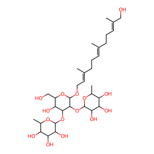 InChI=1S/C33H56O15/c1-16(9-7-11-18(3)14-34)8-6-10-17(2)12-13-43-33-30(48-32-28(42)26(40)23(37)20(5)45-32)29(24(38)21(15-35)46-33)47-31-27(41)25(39)22(36)19(4)44-31/h8,11-12,19-42H,6-7,9-10,13-15H2,1-5H3/b16-8+,17-12+,18-11+/t19-,20-,21+,22-,23-,24+,25+,26+,27+,28+,29-,30+,31-,32-,33+/m0/s1 |