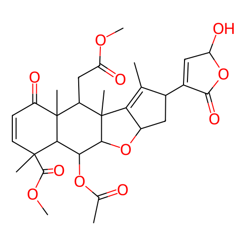 InChI=1S/C30H36O11/c1-13-15(16-11-21(34)41-26(16)35)10-17-22(13)30(5)18(12-20(33)37-6)29(4)19(32)8-9-28(3,27(36)38-7)24(29)23(25(30)40-17)39-14(2)31/h8-9,11,15,17-18,21,23-25,34H,10,12H2,1-7H3/t15-,17-,18-,21?,23-,24+,25-,28-,29+,30-/m1/s1 |