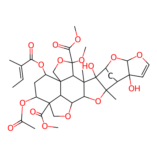 InChI=1S/C36H46O16/c1-9-16(2)25(38)50-19-13-20(49-17(3)37)33(27(39)43-6)14-47-22-23(33)32(19)15-48-35(45-8,28(40)44-7)26(32)30(4)24(22)52-31(5)18-12-21(36(30,31)42)51-29-34(18,41)10-11-46-29/h9-11,18-24,26,29,41-42H,12-15H2,1-8H3/b16-9+/t18-,19+,20-,21+,22-,23-,24-,26+,29+,30-,31-,32+,33+,34+,35+,36+/m1/s1 |