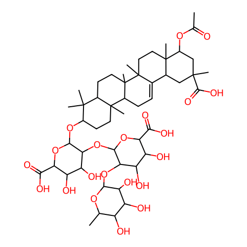 InChI=1S/C50H76O21/c1-20-28(52)29(53)34(58)41(65-20)70-38-33(57)31(55)36(40(61)62)69-43(38)71-37-32(56)30(54)35(39(59)60)68-42(37)67-26-13-14-48(7)24(45(26,3)4)12-15-50(9)25(48)11-10-22-23-18-46(5,44(63)64)19-27(66-21(2)51)47(23,6)16-17-49(22,50)8/h10,20,23-38,41-43,52-58H,11-19H2,1-9H3,(H,59,60)(H,61,62)(H,63,64)/t20-,23-,24-,25+,26-,27+,28-,29+,30-,31-,32-,33-,34+,35-,36-,37+,38+,41-,42+,43-,46-,47+,48-,49+,50+/m0/s1 |