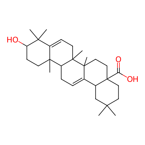 InChI=1S/C30H46O3/c1-25(2)14-16-30(24(32)33)17-15-28(6)19(20(30)18-25)8-9-22-27(5)12-11-23(31)26(3,4)21(27)10-13-29(22,28)7/h8,10,20,22-23,31H,9,11-18H2,1-7H3,(H,32,33)/t20-,22-,23+,27+,28-,29-,30+/m1/s1 |