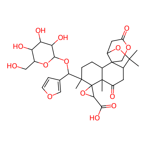 InChI=1S/C32H42O14/c1-28(2)17-9-18(34)30(4)16(31(17)13-42-20(35)10-19(31)45-28)5-7-29(3,32(30)25(46-32)26(39)40)24(14-6-8-41-12-14)44-27-23(38)22(37)21(36)15(11-33)43-27/h6,8,12,15-17,19,21-25,27,33,36-38H,5,7,9-11,13H2,1-4H3,(H,39,40)/t15-,16+,17+,19+,21+,22+,23+,24-,25+,27-,29-,30+,31+,32-/m0/s1;InChI=1S/C32H42O14/c1-28(2)17-9-18(34)30(4)16(31(17)13-42-20(35)10-19(31)45-28)5-7-29(3,32(30)25(46-32)26(39)40)24(14-6-8-41-12-14)44-27-23(38)22(37)21(36)15(11-33)43-27/h6,8,12,15-17,19,21-25,27,33,36-38H,5,7,9-11,13H2,1-4H3,(H,39,40)/t15-,16+,17+,19+,21-,22+,23-,24+,25-,27+,29+,30?,31-,32?/m1/s1;InChI=1S/C32H42O14/c1-28(2)17-9-18(34)30(4)16(31(17)13-42-20(35)10-19(31)45-28)5-7-29(3,32(30)25(46-32)26(39)40)24(14-6-8-41-12-14)44-27-23(38)22(37)21(36)15(11-33)43-27/h6,8,12,15-17,19,21-25,27,33,36-38H,5,7,9-11,13H2,1-4H3,(H,39,40);InChI=1S/C32H42O14/c1-28(2)17-9-18(34)30(4)16(31(17)13-42-20(35)10-19(31)45-28)5-7-29(3,32(30)25(46-32)26(39)40)24(14-6-8-41-12-14)44-27-23(38)22(37)21(36)15(11-33)43-27/h6,8,12,15-17,19,21-25,27,33,36-38H,5,7,9-11,13H2,1-4H3,(H,39,40)/t15-,16+,17+,19+,21-,22+,23-,24+,25-,27+,29+,30+,31-,32-/m1/s1;InChI=1S/C32H42O14/c1-28(2)17-9-18(34)30(4)16(31(17)13-42-20(35)10-19(31)45-28)5-7-29(3,32(30)25(46-32)26(39)40)24(14-6-8-41-12-14)44-27-23(38)22(37)21(36)15(11-33)43-27/h6,8,12,15-17,19,21-25,27,33,36-38H,5,7,9-11,13H2,1-4H3,(H,39,40)/t15?,16?,17?,19?,21?,22?,23?,24?,25?,27?,29-,30-,31+,32+/m0/s1 |