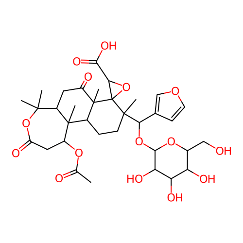 InChI=1S/C34H46O15/c1-15(36)45-21-12-22(38)48-30(2,3)19-11-20(37)33(6)18(32(19,21)5)7-9-31(4,34(33)27(49-34)28(42)43)26(16-8-10-44-14-16)47-29-25(41)24(40)23(39)17(13-35)46-29/h8,10,14,17-19,21,23-27,29,35,39-41H,7,9,11-13H2,1-6H3,(H,42,43)/t17-,18-,19+,21-,23-,24+,25-,26?,27+,29+,31+,32-,33+,34?/m1/s1 |