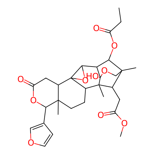 InChI=1S/C30H38O10/c1-6-19(31)38-24-22-25-29(40-25)16(28(4)17(11-20(32)35-5)27(24,3)14-37-30(22,28)34)7-9-26(2)18(29)12-21(33)39-23(26)15-8-10-36-13-15/h8,10,13,16-18,22-25,34H,6-7,9,11-12,14H2,1-5H3/t16-,17+,18-,22+,23+,24-,25-,26-,27-,28+,29-,30-/m1/s1 |