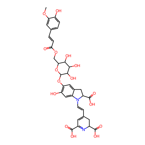 InChI=1S/C34H34N2O16/c1-49-24-10-15(2-4-22(24)37)3-5-27(39)50-14-26-28(40)29(41)30(42)34(52-26)51-25-12-17-11-21(33(47)48)36(20(17)13-23(25)38)7-6-16-8-18(31(43)44)35-19(9-16)32(45)46/h2-8,10,12-13,19,21,26,28-30,34,37-38,40-42H,9,11,14H2,1H3,(H,43,44)(H,45,46)(H,47,48)/t19-,21-,26+,28+,29-,30+,34+/m0/s1 |