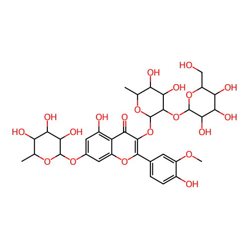 InChI=1S/C34H42O20/c1-10-20(38)24(42)27(45)32(48-10)50-13-7-15(37)19-17(8-13)51-29(12-4-5-14(36)16(6-12)47-3)30(23(19)41)53-34-31(26(44)21(39)11(2)49-34)54-33-28(46)25(43)22(40)18(9-35)52-33/h4-8,10-11,18,20-22,24-28,31-40,42-46H,9H2,1-3H3/t10-,11-,18+,20-,21-,22+,24+,25-,26+,27+,28+,31+,32-,33-,34-/m0/s1 |