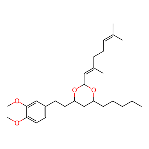 InChI=1S/C28H44O4/c1-7-8-9-13-24-20-25(16-14-23-15-17-26(29-5)27(19-23)30-6)32-28(31-24)18-22(4)12-10-11-21(2)3/h11,15,17-19,24-25,28H,7-10,12-14,16,20H2,1-6H3/b22-18-/t24-,25+,28-/m1/s1 |