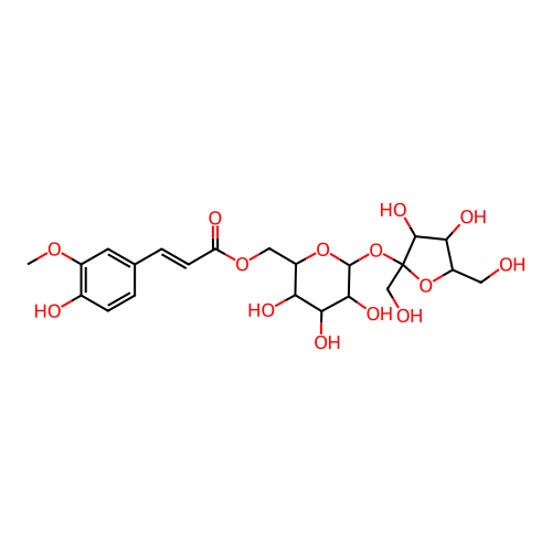 InChI=1S/C22H30O14/c1-32-12-6-10(2-4-11(12)25)3-5-15(26)33-8-14-16(27)18(29)19(30)21(34-14)36-22(9-24)20(31)17(28)13(7-23)35-22/h2-6,13-14,16-21,23-25,27-31H,7-9H2,1H3;InChI=1S/C22H30O14/c1-32-12-6-10(2-4-11(12)25)3-5-15(26)33-8-14-16(27)18(29)19(30)21(34-14)36-22(9-24)20(31)17(28)13(7-23)35-22/h2-6,13-14,16-21,23-25,27-31H,7-9H2,1H3/t13?,14?,16?,17?,18?,19?,20?,21?,22-/m0/s1;InChI=1S/C22H30O14/c1-32-12-6-10(2-4-11(12)25)3-5-15(26)33-8-14-16(27)18(29)19(30)21(34-14)36-22(9-24)20(31)17(28)13(7-23)35-22/h2-6,13-14,16-21,23-25,27-31H,7-9H2,1H3/b5-3+;InChI=1S/C22H30O14/c1-32-12-6-10(2-4-11(12)25)3-5-15(26)33-8-14-16(27)18(29)19(30)21(34-14)36-22(9-24)20(31)17(28)13(7-23)35-22/h2-6,13-14,16-21,23-25,27-31H,7-9H2,1H3/b5-3+/t13-,14-,16-,17-,18+,19-,20+,21-,22+/m1/s1;InChI=1S/C22H30O14/c1-32-12-6-10(2-4-11(12)25)3-5-15(26)33-8-14-16(27)18(29)19(30)21(34-14)36-22(9-24)20(31)17(28)13(7-23)35-22/h2-6,13-14,16-21,23-25,27-31H,7-9H2,1H3/b5-3+/t13?,14-,16-,17?,18+,19-,20?,21-,22?/m1/s1 |