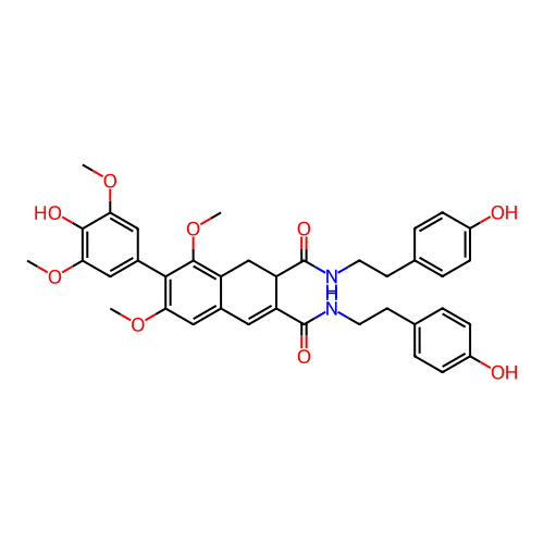 InChI=1S/C38H40N2O9/c1-46-31-18-24-17-29(37(44)39-15-13-22-5-9-26(41)10-6-22)30(38(45)40-16-14-23-7-11-27(42)12-8-23)21-28(24)36(49-4)34(31)25-19-32(47-2)35(43)33(20-25)48-3/h5-12,17-20,30,41-43H,13-16,21H2,1-4H3,(H,39,44)(H,40,45) |