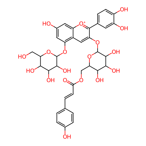 InChI=1S/C36H36O18/c37-13-25-28(43)30(45)32(47)35(53-25)51-23-11-18(39)10-22-19(23)12-24(34(50-22)16-4-7-20(40)21(41)9-16)52-36-33(48)31(46)29(44)26(54-36)14-49-27(42)8-3-15-1-5-17(38)6-2-15/h1-12,25-26,28-33,35-37,43-48H,13-14H2,(H3-,38,39,40,41,42)/p+1/t25-,26-,28-,29-,30+,31+,32-,33-,35-,36-/m1/s1 |