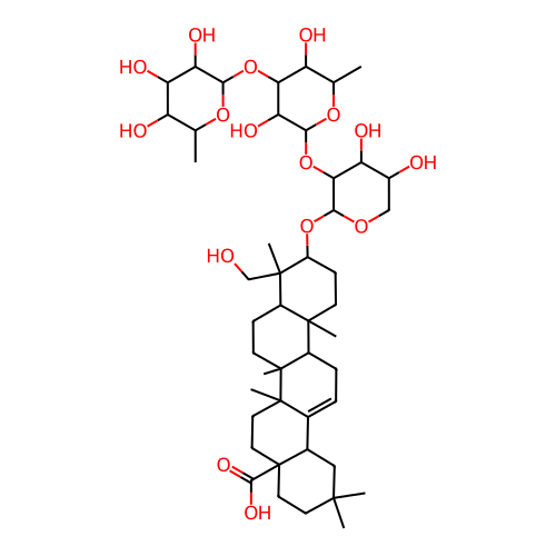 InChI=1S/C47H76O16/c1-22-30(50)33(53)34(54)38(59-22)62-36-31(51)23(2)60-39(35(36)55)63-37-32(52)26(49)20-58-40(37)61-29-12-13-43(5)27(44(29,6)21-48)11-14-46(8)28(43)10-9-24-25-19-42(3,4)15-17-47(25,41(56)57)18-16-45(24,46)7/h9,22-23,25-40,48-55H,10-21H2,1-8H3,(H,56,57)/t22-,23-,25-,26-,27+,28+,29-,30-,31-,32-,33+,34+,35+,36+,37+,38-,39-,40-,43-,44-,45+,46+,47-/m0/s1 |