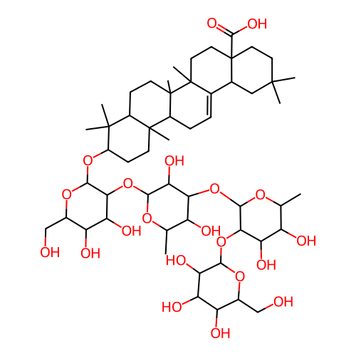 InChI=1S/C54H88O21/c1-23-32(57)37(62)42(74-44-39(64)36(61)34(59)27(21-55)70-44)46(69-23)73-41-33(58)24(2)68-45(40(41)65)75-43-38(63)35(60)28(22-56)71-47(43)72-31-13-14-51(7)29(50(31,5)6)12-15-53(9)30(51)11-10-25-26-20-49(3,4)16-18-54(26,48(66)67)19-17-52(25,53)8/h10,23-24,26-47,55-65H,11-22H2,1-9H3,(H,66,67)/t23-,24-,26-,27+,28+,29-,30+,31-,32-,33-,34+,35+,36-,37+,38-,39+,40+,41+,42+,43+,44-,45-,46-,47-,51-,52+,53+,54-/m0/s1 |