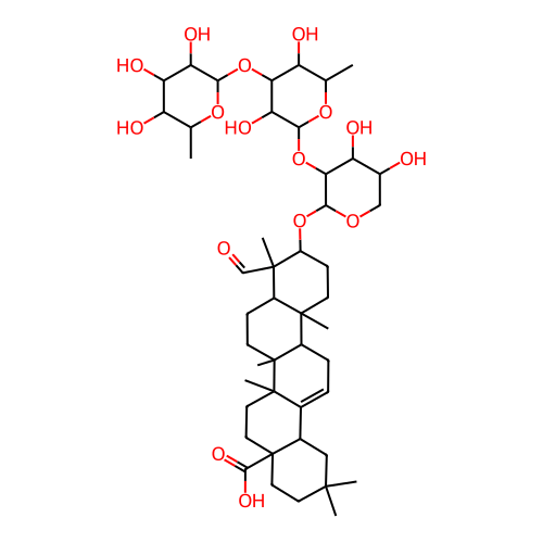InChI=1S/C47H74O16/c1-22-30(50)33(53)34(54)38(59-22)62-36-31(51)23(2)60-39(35(36)55)63-37-32(52)26(49)20-58-40(37)61-29-12-13-43(5)27(44(29,6)21-48)11-14-46(8)28(43)10-9-24-25-19-42(3,4)15-17-47(25,41(56)57)18-16-45(24,46)7/h9,21-23,25-40,49-55H,10-20H2,1-8H3,(H,56,57)/t22-,23-,25-,26-,27+,28+,29-,30-,31-,32-,33+,34+,35+,36+,37+,38-,39-,40-,43-,44-,45+,46+,47-/m0/s1 |