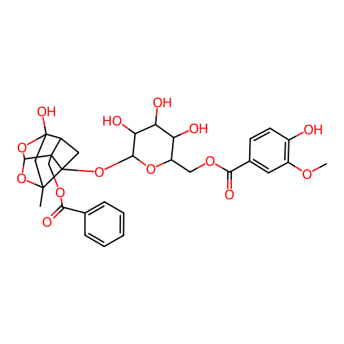 InChI=1S/C31H34O14/c1-28-13-30(38)20-11-31(28,29(20,27(44-28)45-30)14-41-24(36)15-6-4-3-5-7-15)43-26-23(35)22(34)21(33)19(42-26)12-40-25(37)16-8-9-17(32)18(10-16)39-2/h3-10,19-23,26-27,32-35,38H,11-14H2,1-2H3/t19-,20-,21-,22+,23-,26+,27-,28+,29+,30-,31+/m1/s1 |